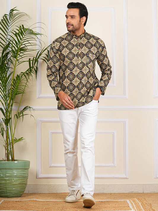 Black Royal Floral Print Full Sleeves Short Kurta for Men