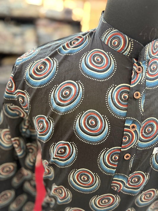 Black and Brown Ajrak Printed Short Kurta For Men