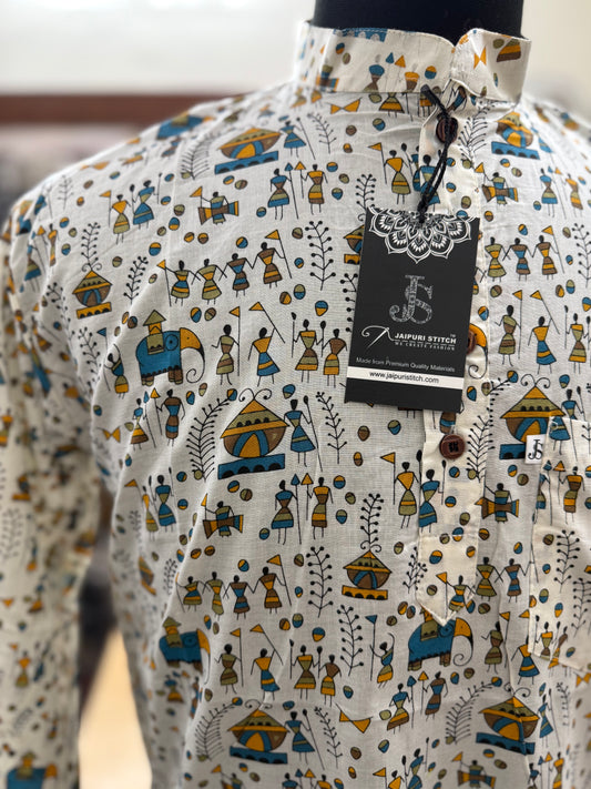 Tribal Warli Art Printed Full Sleeves Short Kurta for Men
