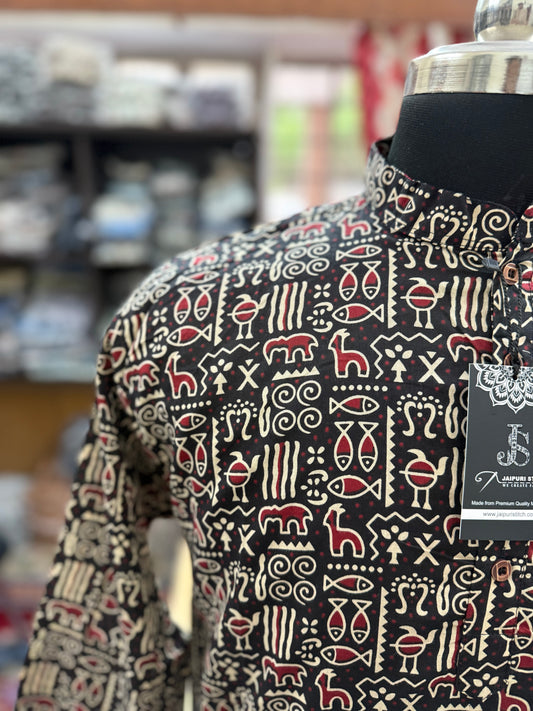 Tribal Warli Printed Full Sleeves Short Kurta for Men