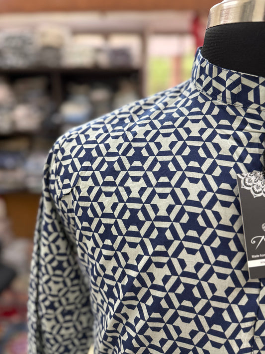 Navy Blue Geometric Star Block Printed Full Sleeves Short Kurta for Men