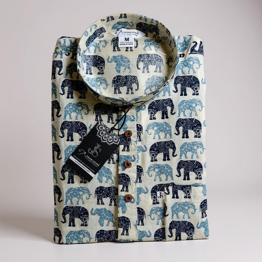 Dark and Light Blue Elephant Printed Full Sleeves Short Kurta for Men