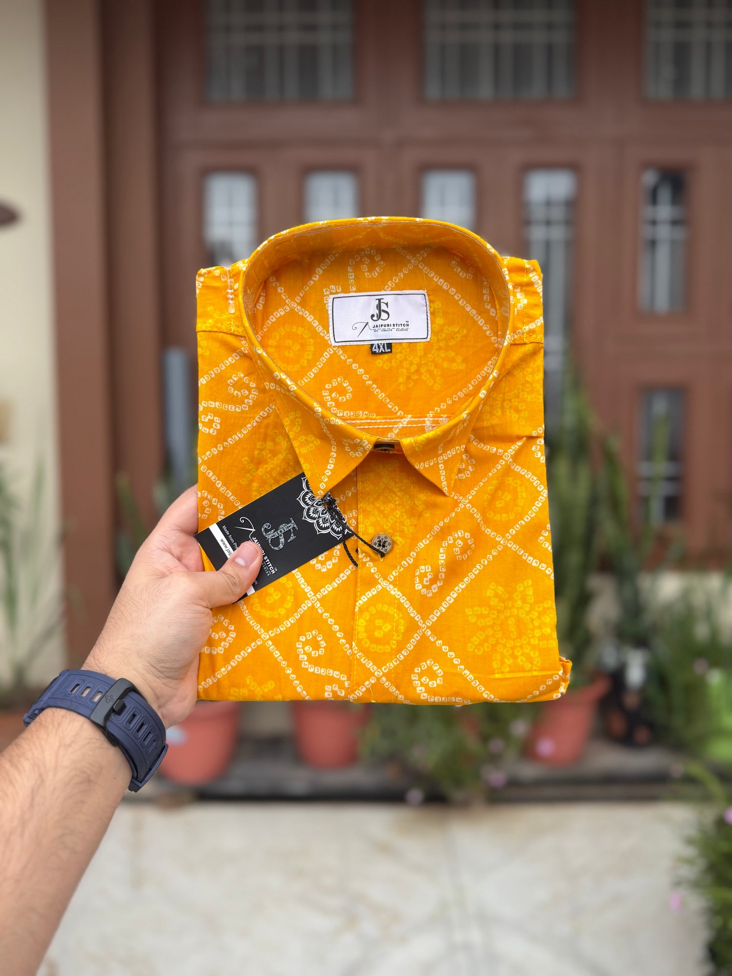 Yellow Bandhani/Bandhej Printed Mens Half Sleeves Cotton Shirt
