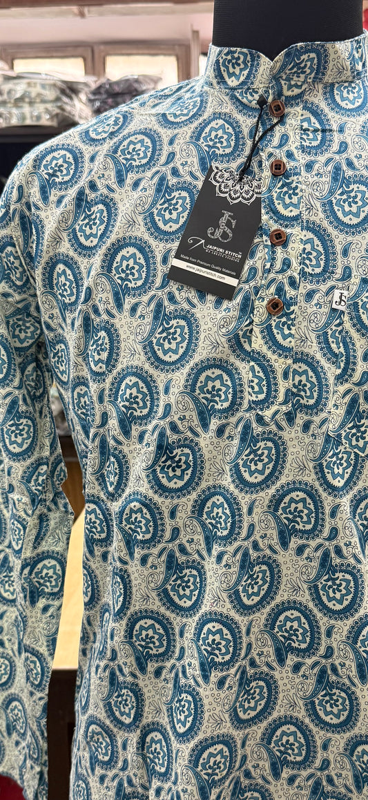 Blue Mosaic Printed Full Sleeves Short Kurta for Men