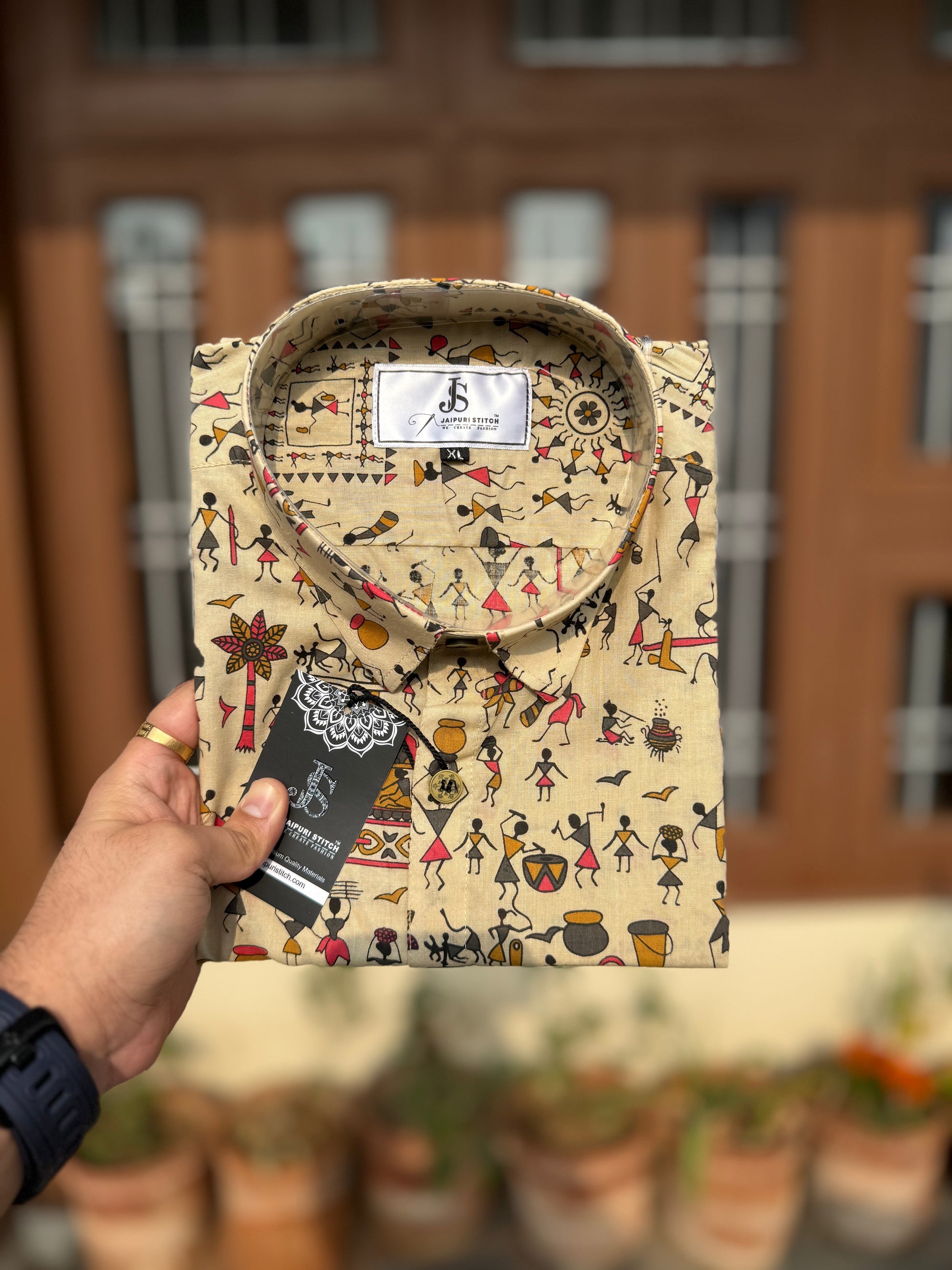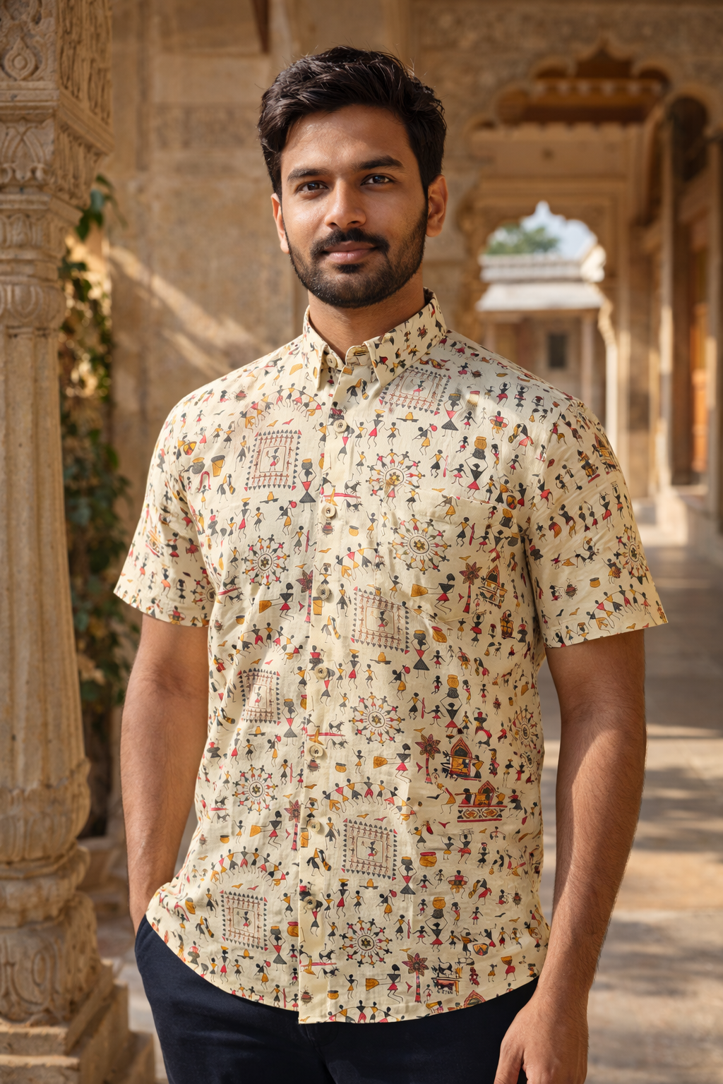 Celebrate India’s rich folk heritage with this Beige Tribal Folk Art Printed Men’s Half Sleeves Cotton Shirt, inspired by traditional Warli-style storytelling motifs. The detailed tribal illustrations on a warm beige base create a perfect balance of heritage charm and modern appeal.