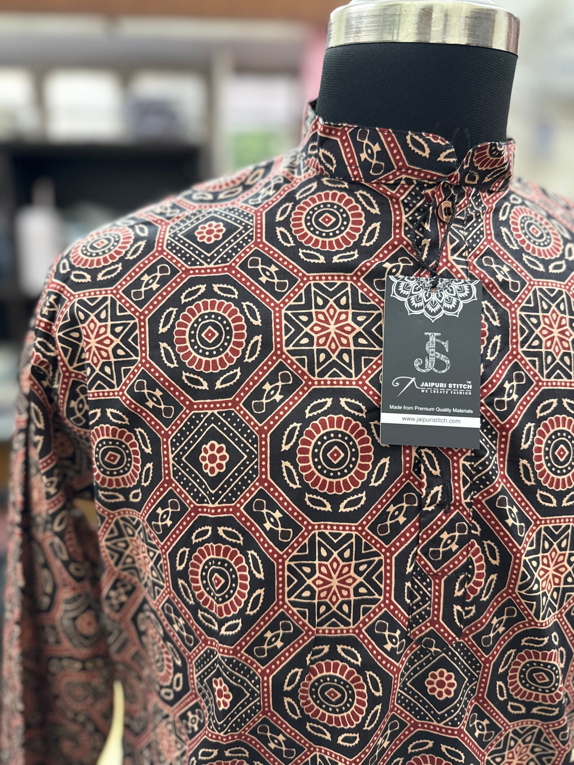 Channel classic Ajrakh elegance with this long kurta featuring intricate mandala motifs on a deep black base touched with terracotta and beige. The neat mandarin (band) collar, full sleeves, and side slits keep it refined yet easy to move in. Crafted in breathable 100% cotton, it’s your all-day-comfortable pick for poojas, weddings, festive dinners, or office ethnic days. A regular-fit silhouette ensures room through the chest and waist (not slim), making it effortless to style traditional or Indo-fusion.