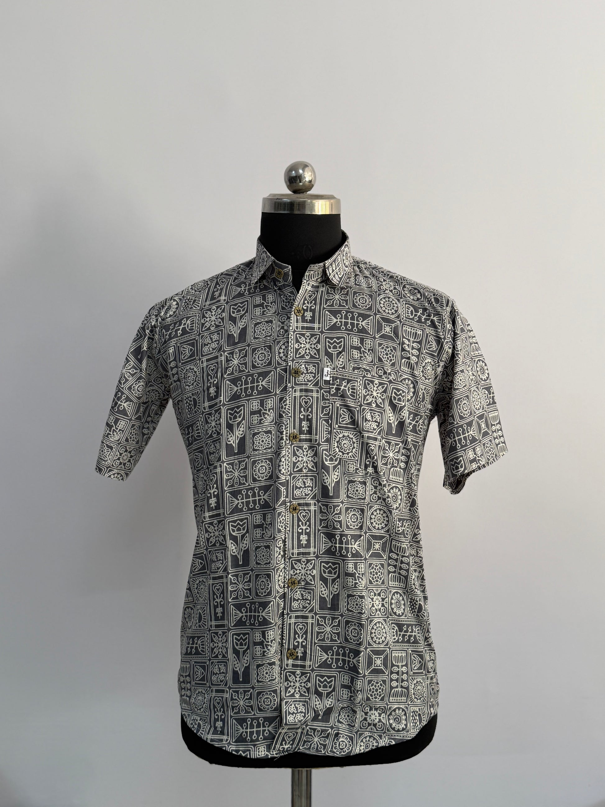 Bring refined ethnic charm to your wardrobe with this Grey Heritage Block Printed Half Sleeves Cotton Shirt for Menfrom JaipuriStitch. Designed with an intricate heritage-inspired block pattern, the shirt features a sophisticated grid of traditional motifs printed across a subtle grey base, giving it a unique artisanal appeal.