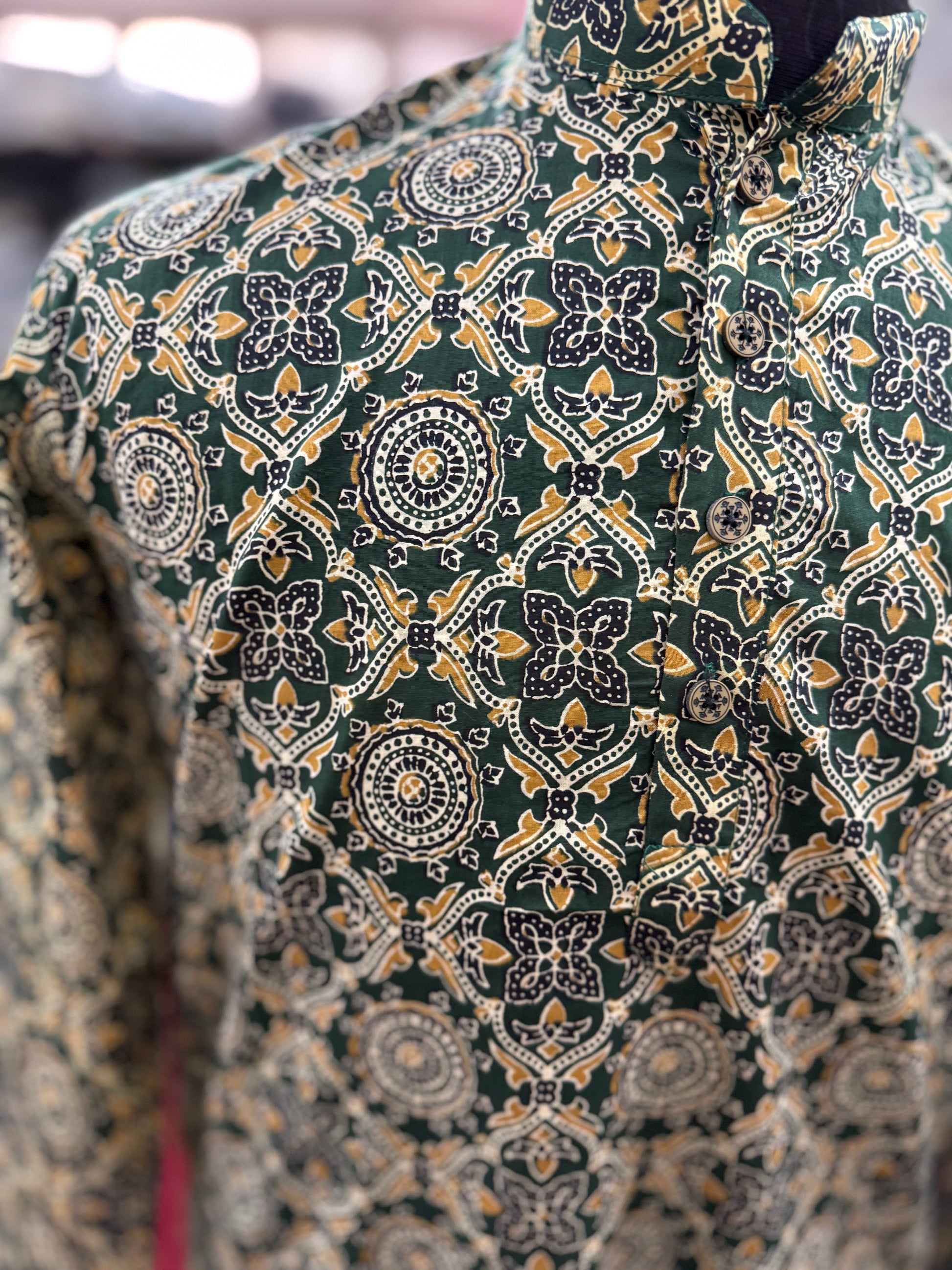 Bring royal-courtyard vibes to your Diwali look with this green Meenakari-inspired jaal print long kurta. Crafted in breathable 100% cotton, it pairs traditional Jaipuri artistry with a clean, modern silhouette—perfect for pooja, get-togethers and festive nights. The rich emerald base with gold-toned motifs elevates your style while the mandarin collar & full sleeves keep it classy and comfortable all day.