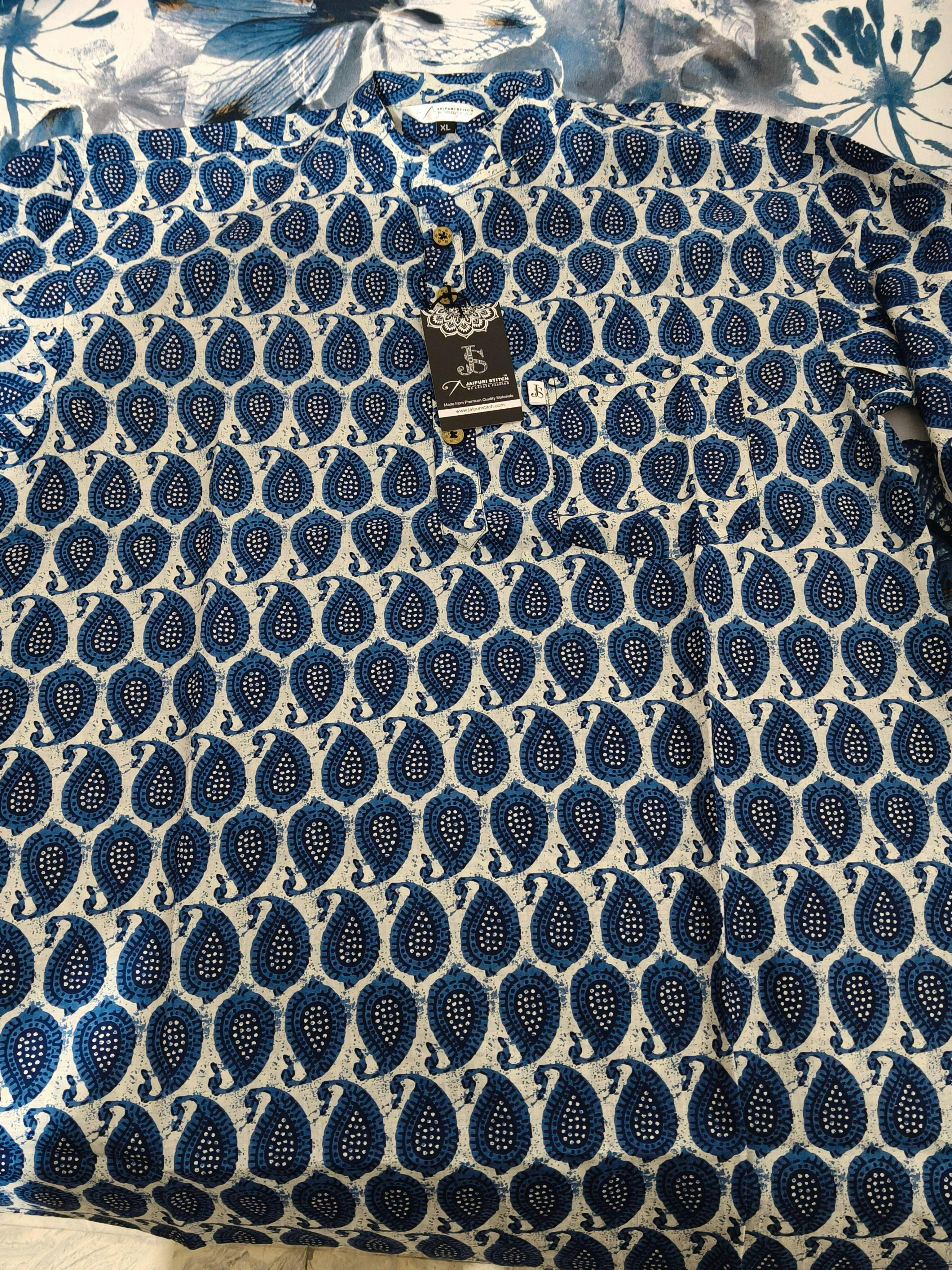 Bring timeless tradition into your wardrobe with our Indigo Boota Printed Full Sleeves Short Kurta for Men. Made from soft and breathable 60:60 Cambric Cotton, this kurta features an elegant boota (paisley-inspired) block print in rich indigo hues. The wooden buttons and mandarin collar add a refined ethnic touch, while the short length makes it perfect for pairing with jeans, trousers, or even dhotis.