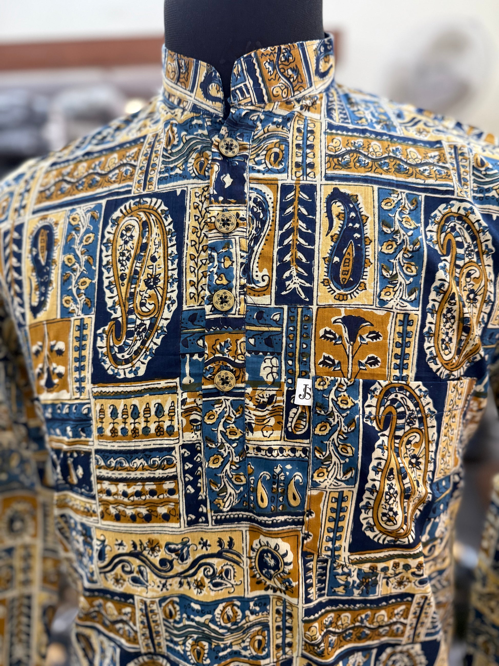 Bring heritage charm to your festive wardrobe with this Indigo Mughal Patch Printed Full Sleeves Short Kurta for men. Inspired by traditional Mughal and Rajasthani block art, the kurta features a rich patch-style layout with intricate motifs, borders, and heritage symbols arranged in a structured pattern.