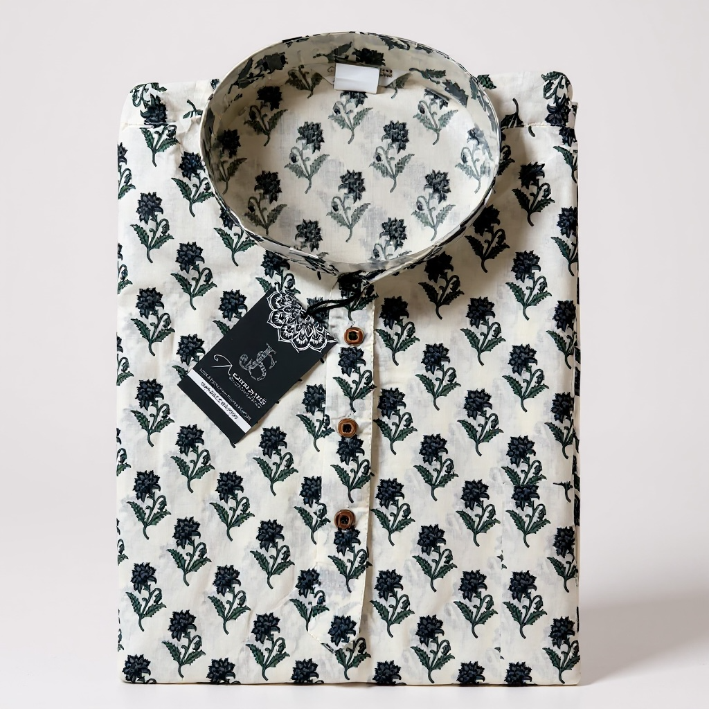 Understated and elegant, this long kurta pairs a soft ivory base with neat black floral booti blocks in a diagonal layout. The mandarin (band) collar, full sleeves, and side slits add a classic silhouette, while breathable 100% cotton keeps you comfortable for poojas, festive dinners, weddings, and office ethnic days. Regular fit—easy through chest & waist (not slim).