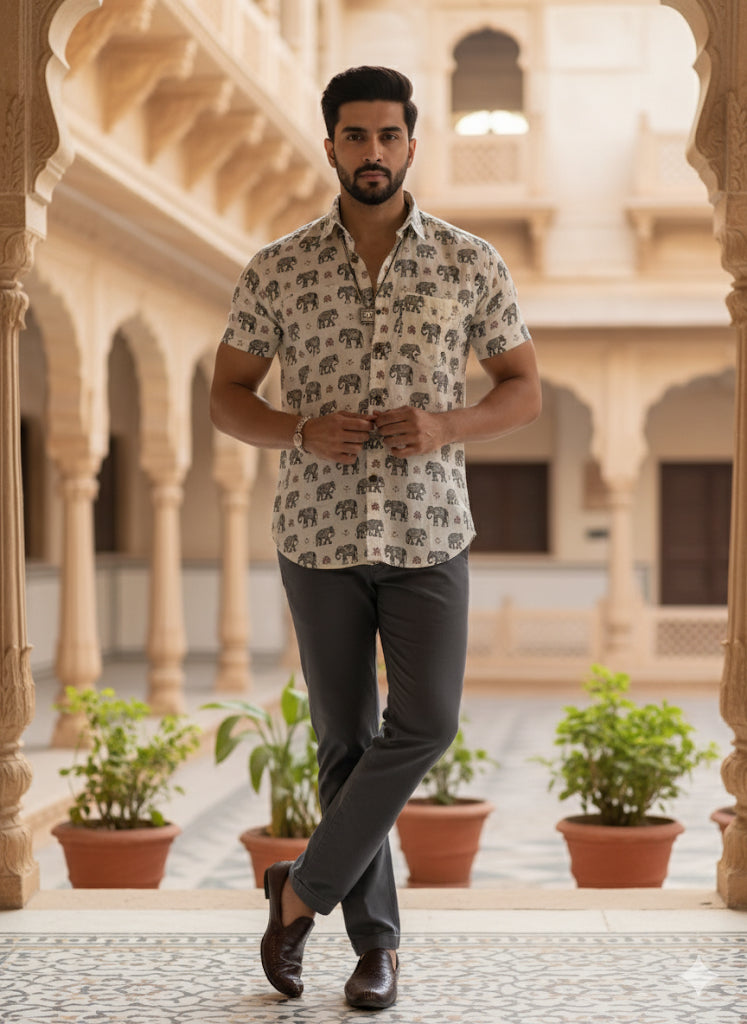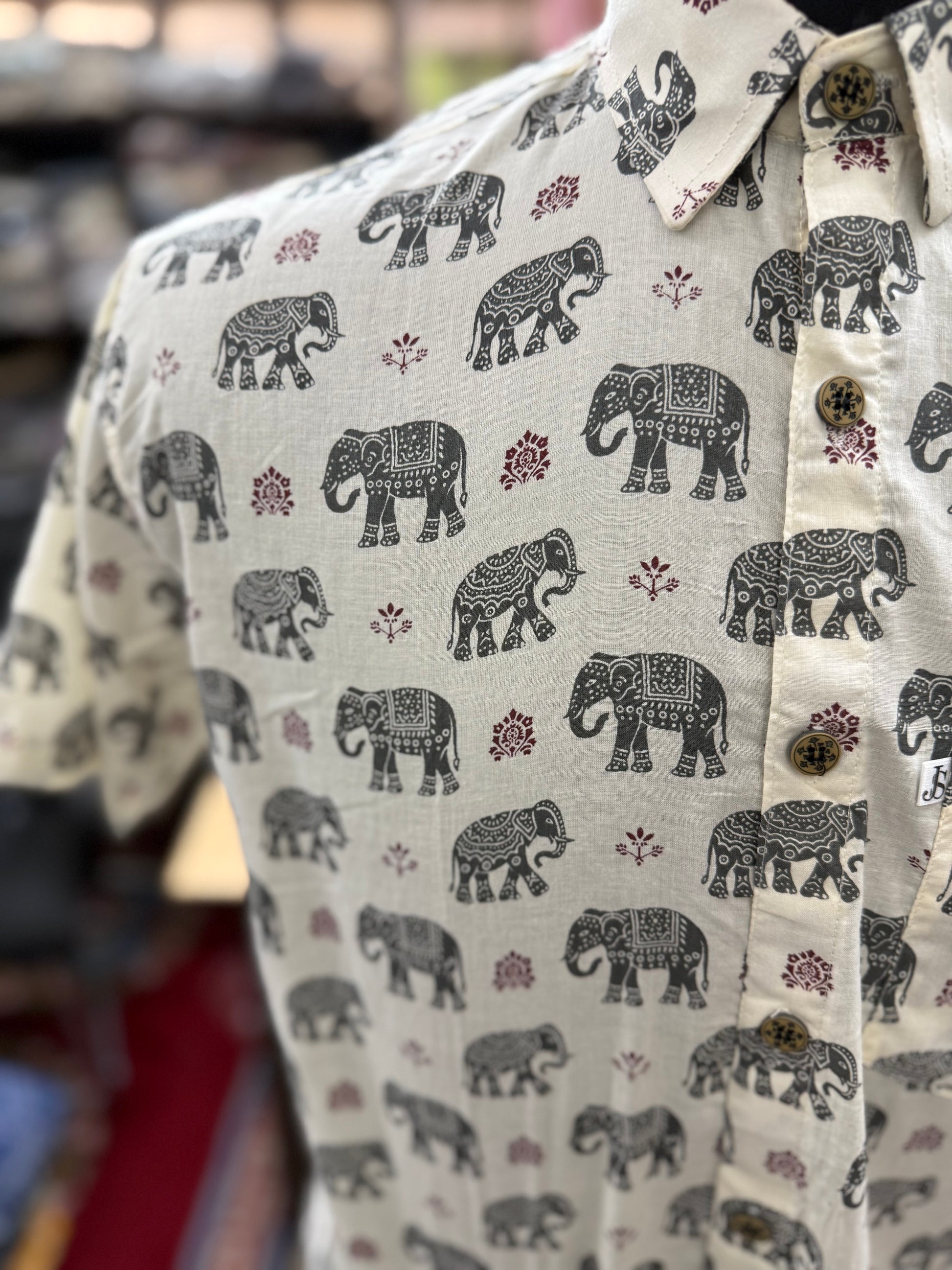Ivory Grey Elephant Printed Plus Size Half Sleeves Cotton Shirt