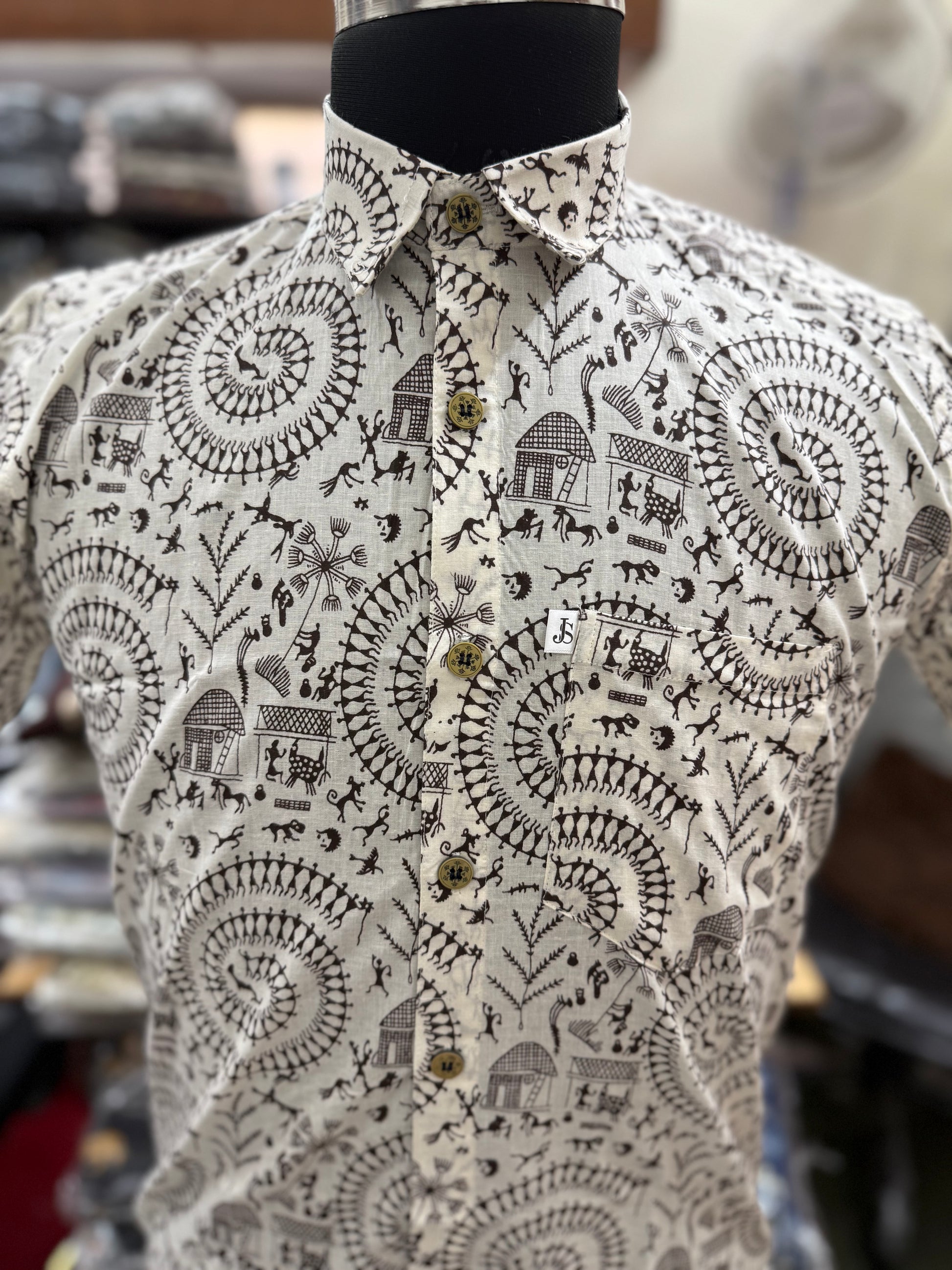 Bring understated elegance to your wardrobe with this Ivory Spiral Motif Printed Half Sleeves Cotton Shirt for men. Inspired by traditional Rajasthani and folk-art elements, the intricate spiral and heritage motifs in subtle earthy tones create a calm, sophisticated look.