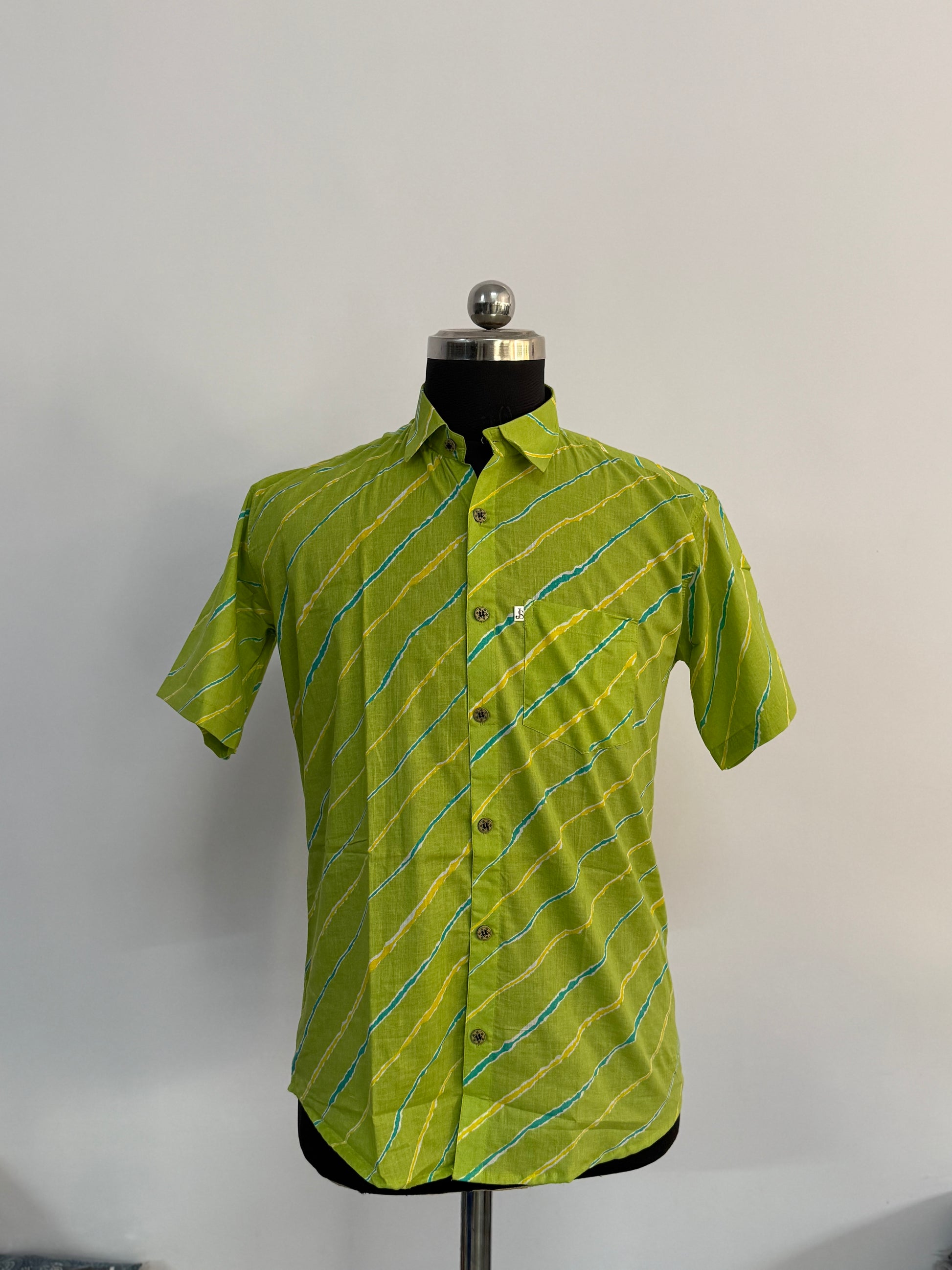 Crafted from lightweight and breathable cotton, the shirt ensures maximum comfort throughout the day while maintaining a crisp and stylish appearance. The bright lime green base combined with the flowing wave pattern reflects the rich textile heritage of Jaipur while keeping the design modern and versatile.