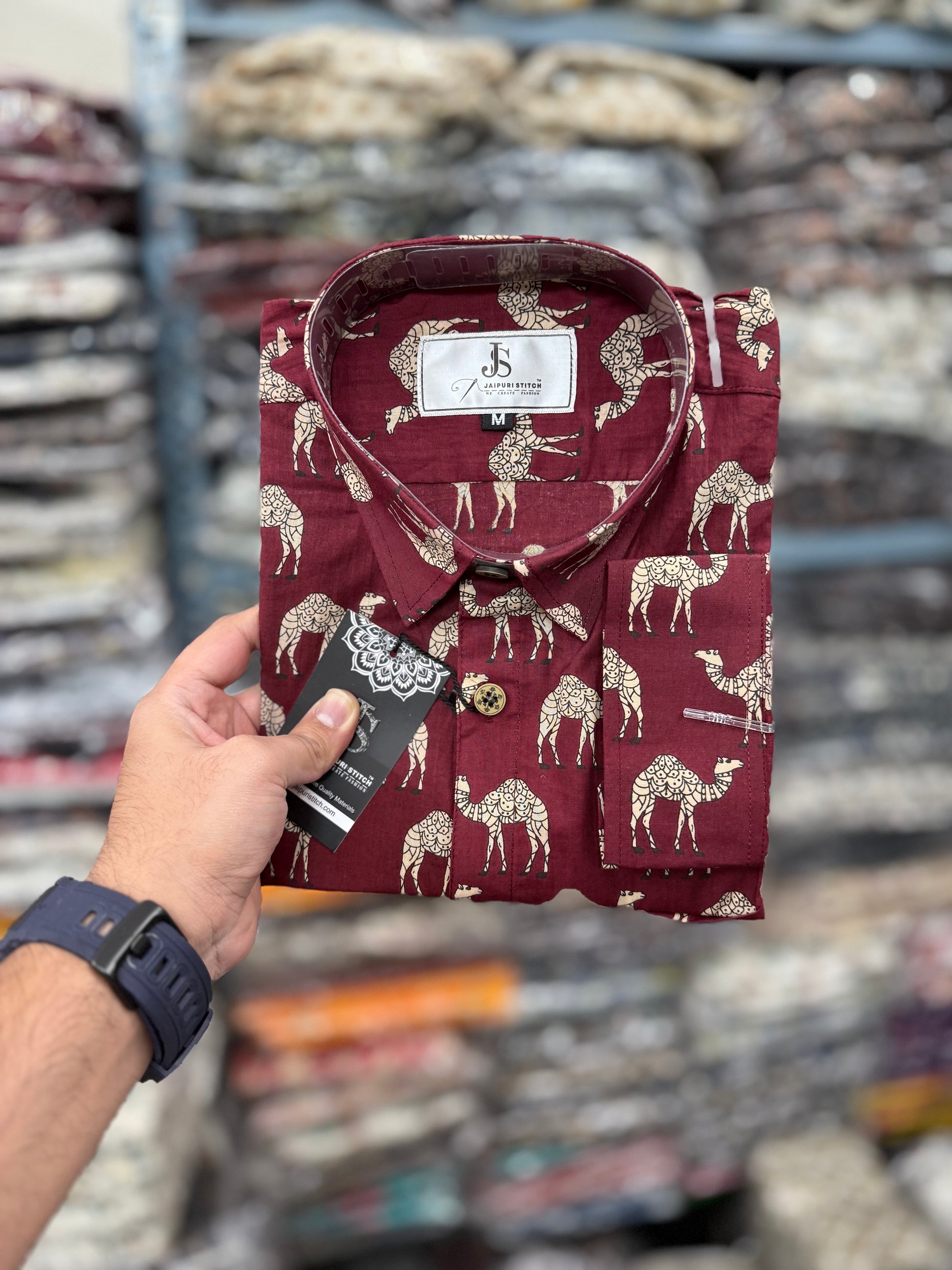 Step into timeless Rajasthani charm with our Maroon Camel Caravan Printed Shirt, an ode to the desert’s royal heritage.