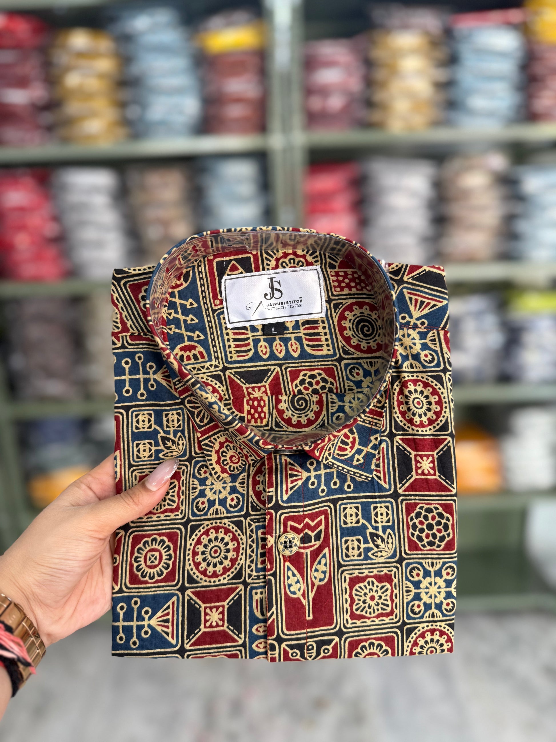 Crafted from soft, breathable cotton, the fabric ensures comfort throughout the day while maintaining a clean and structured look. The unique motif blocks draw inspiration from traditional Indian art elements, giving the shirt a distinctive handcrafted aesthetic.