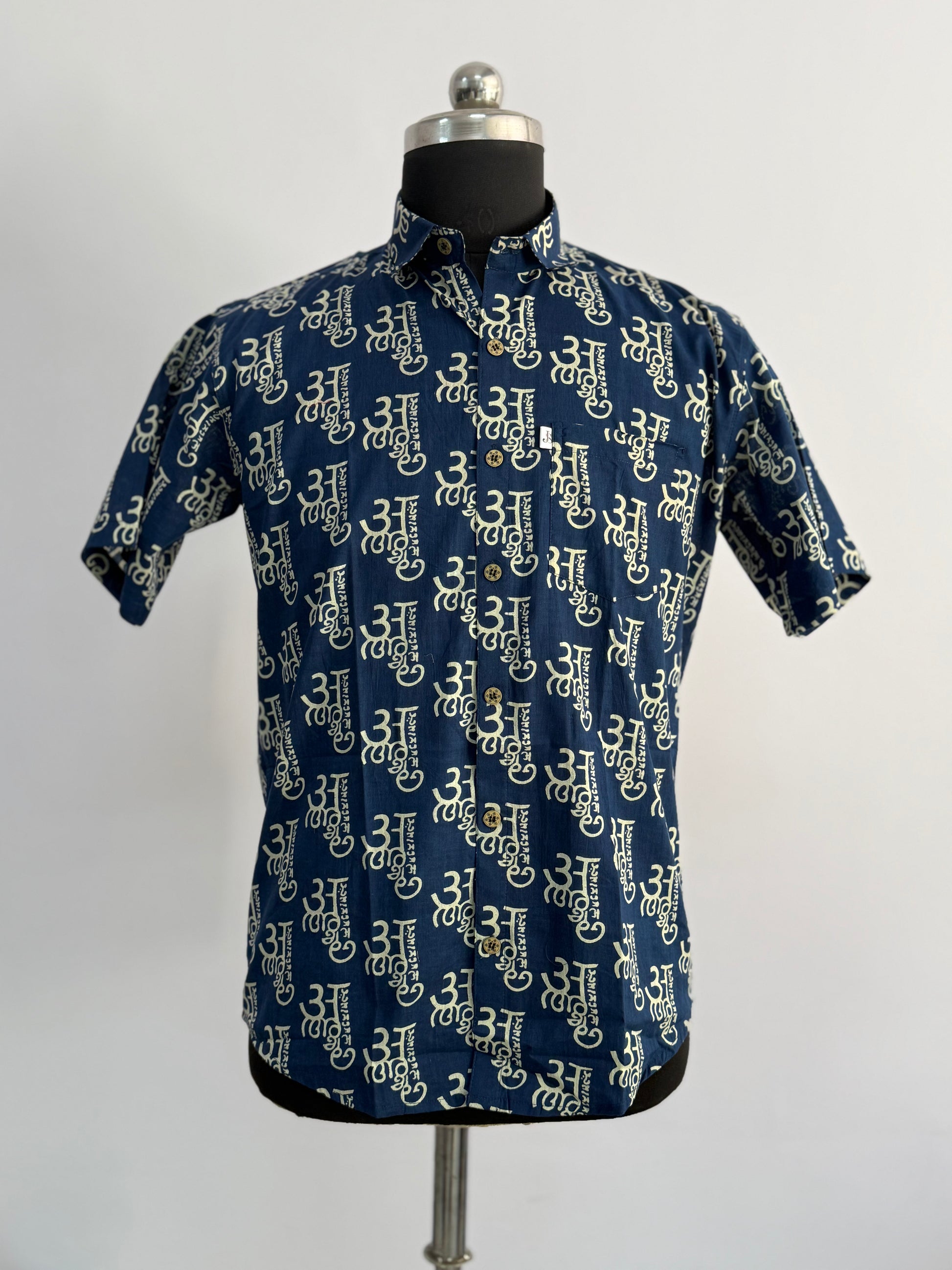 Add a unique artistic touch to your wardrobe with this Navy Devanagari Alphabet Printed Half Sleeves Cotton Shirt for Men from JaipuriStitch. Designed with an all-over Devanagari alphabet inspired print, this shirt brings a subtle cultural aesthetic to a modern everyday silhouette.