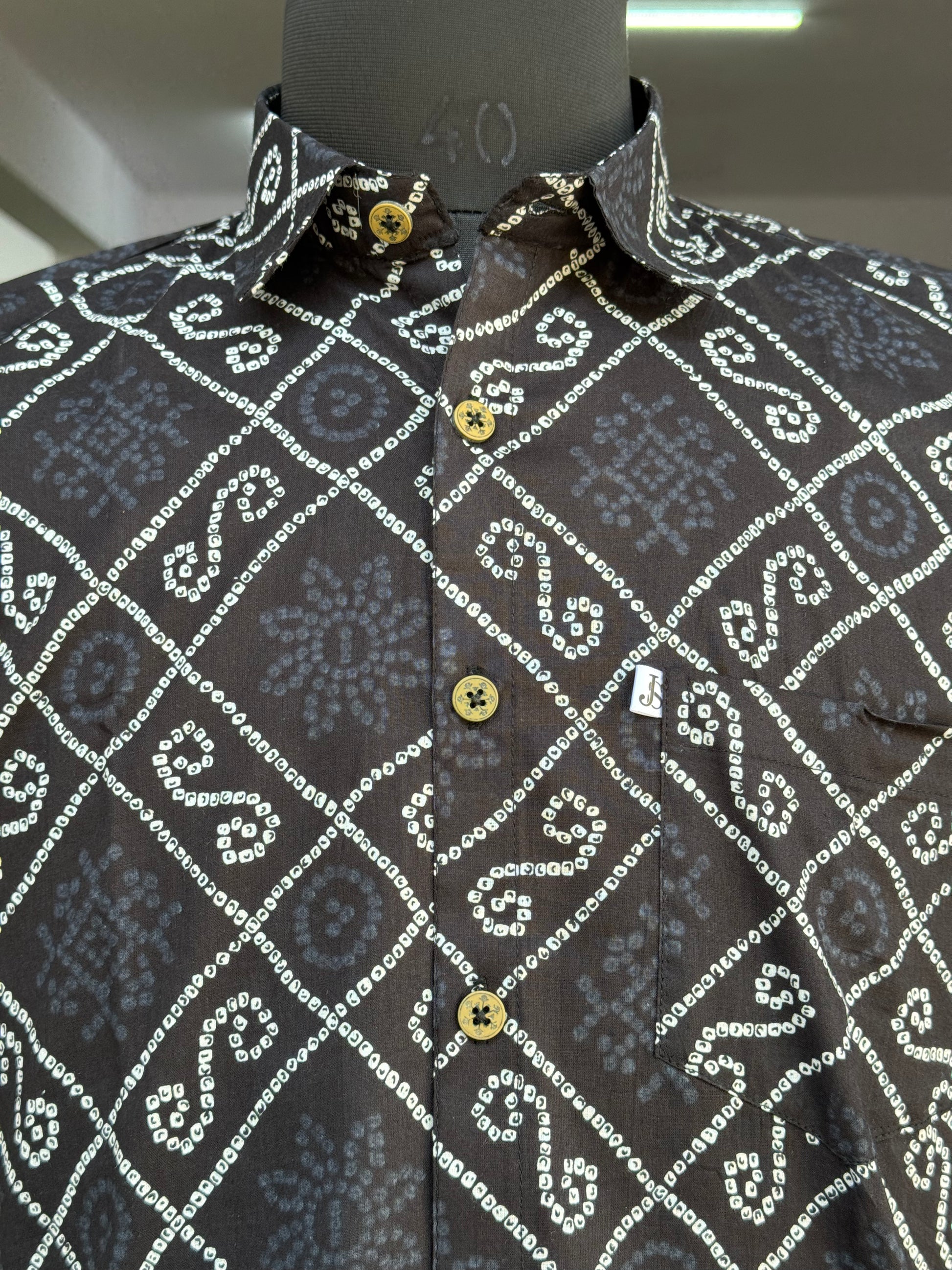 Add a touch of timeless tradition to your wardrobe with our New Black Bandhani/Bandhej Printed Shirt. Designed on a rich black base with classic bandhej-inspired motifs, this shirt brings together heritage craftsmanship and modern styling.
