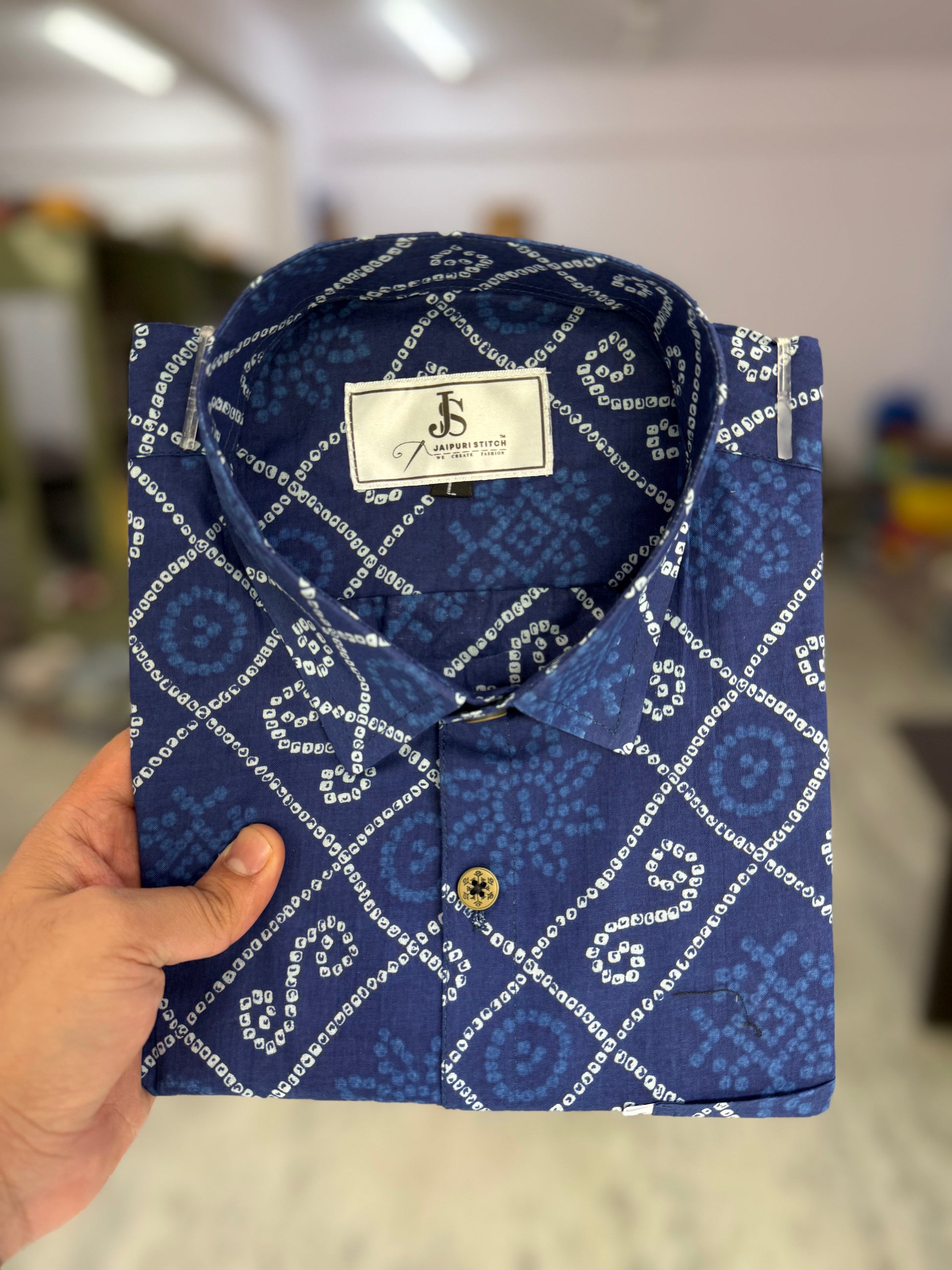 New Blue Bandhani/Bandhej Printed Mens Half Sleeves Cotton Shirt