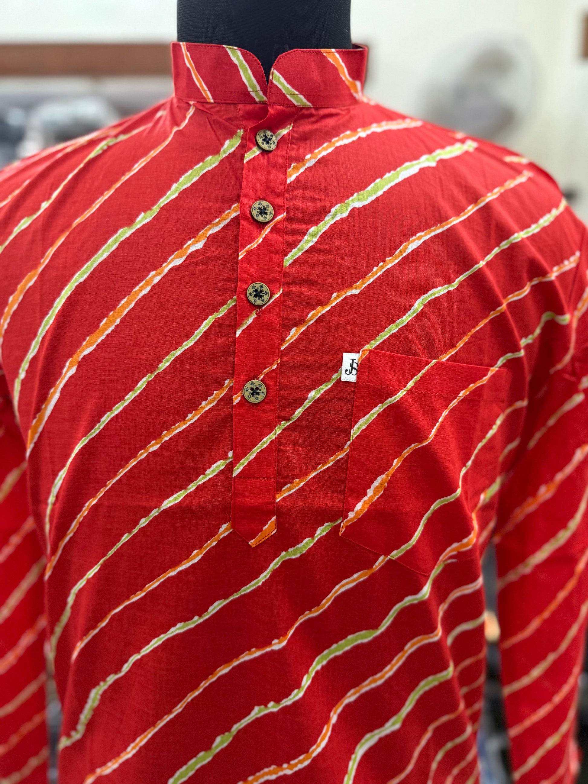 Add a bold festive edge to your ethnic wardrobe with this Red Leheriya Stripe Printed Full Sleeves Short Kurta for men. Inspired by Rajasthan’s iconic Leheriya wave patterns, the diagonal stripes in subtle golden tones over a rich red base create a vibrant yet classy traditional look.