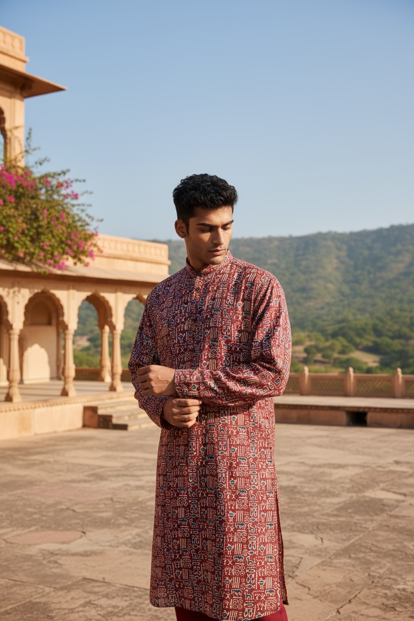 Make a bold statement in earthy tones with this rust-red Warli-printed long kurta, celebrating India’s tribal artistry with a modern twist. Crafted from soft 100% cotton, it’s light, breathable, and festive-perfect. The geometric and human motif patterns bring rustic charm, while the mandarin collar and long silhouette add a refined edge. Whether it’s Diwali pooja or a cultural celebration, this kurta keeps you stylish yet comfortable.
