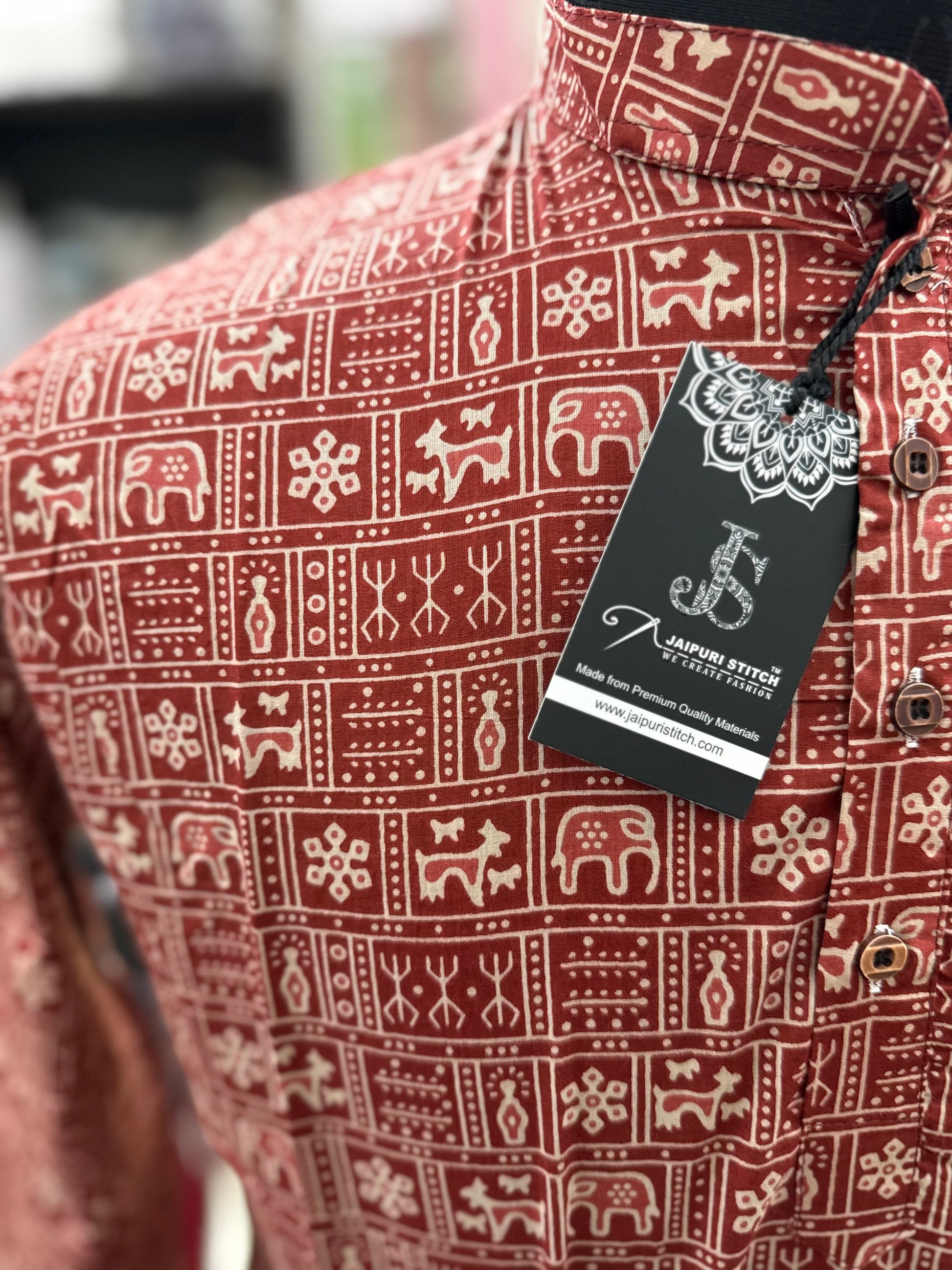 Step into a heritage vibe with LalHaveli, a long kurta in rustic red featuring miniature haveli/animal block tiles. The neat mandarin (band) collar and full sleeves keep it classic, while the breathable 100% cotton and side slits make it easy for all-day wear—from poojas and festive dinners to office ethnic Fridays. A regular-fit silhouette gives room through chest and waist (not slim), so it drapes clean without feeling tight.