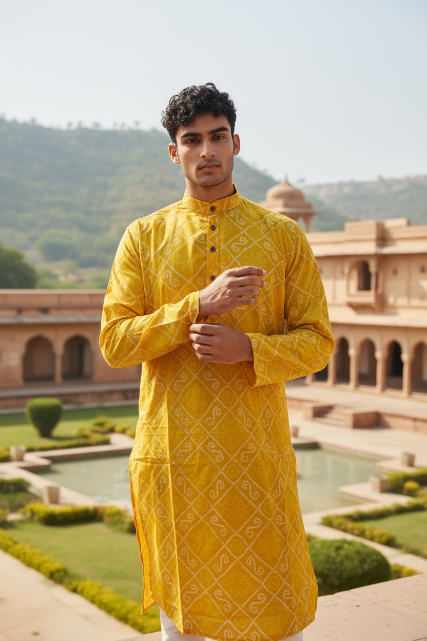 Yellow Bandhani Diamond Printed Full Sleeves Long Kurta for Men