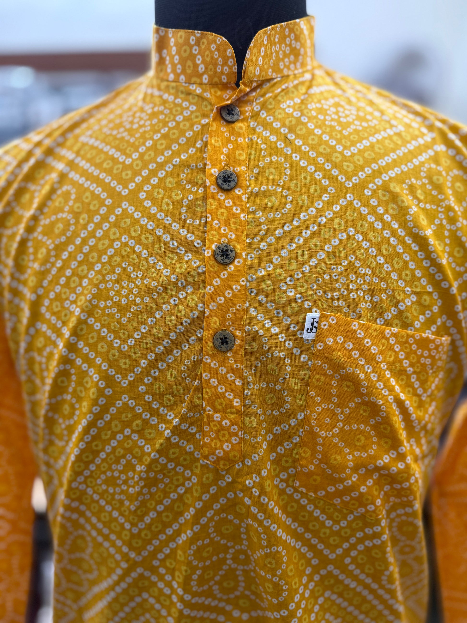 Yellow Bandhej Box Printed Full Sleeves Short Kurta for Men