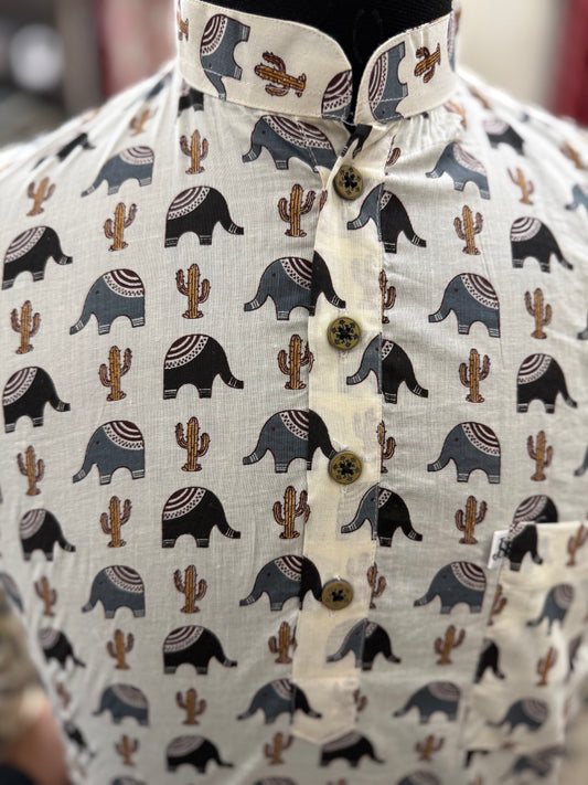 Ivory Blue Cactus & Elephant Printed Full Sleeves Short Kurta for Men