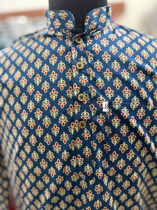 Blue Mughal Booti Printed Full Sleeves Short Kurta for Men
