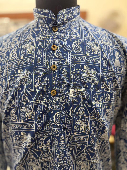 Blue Warli Art Printed Full Sleeves Short Kurta for Men